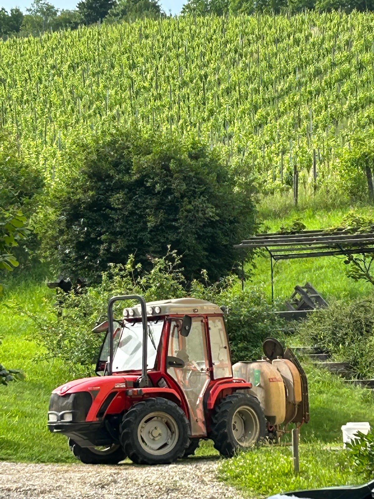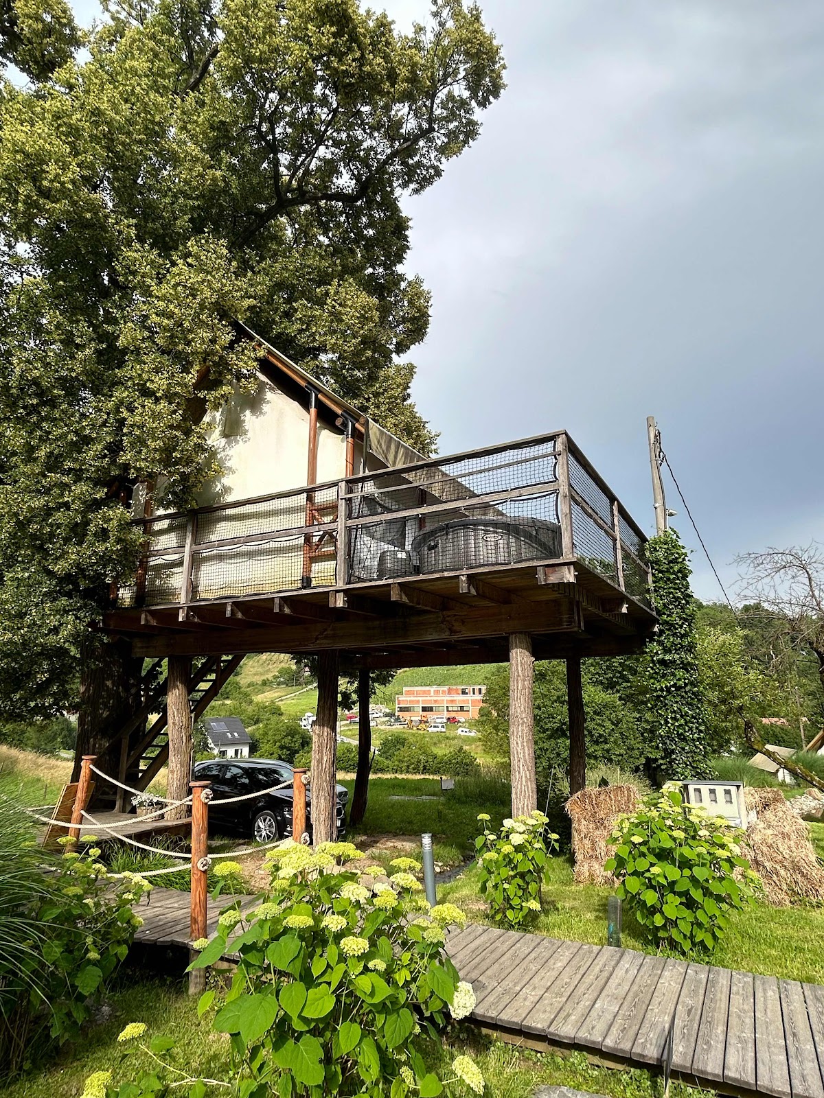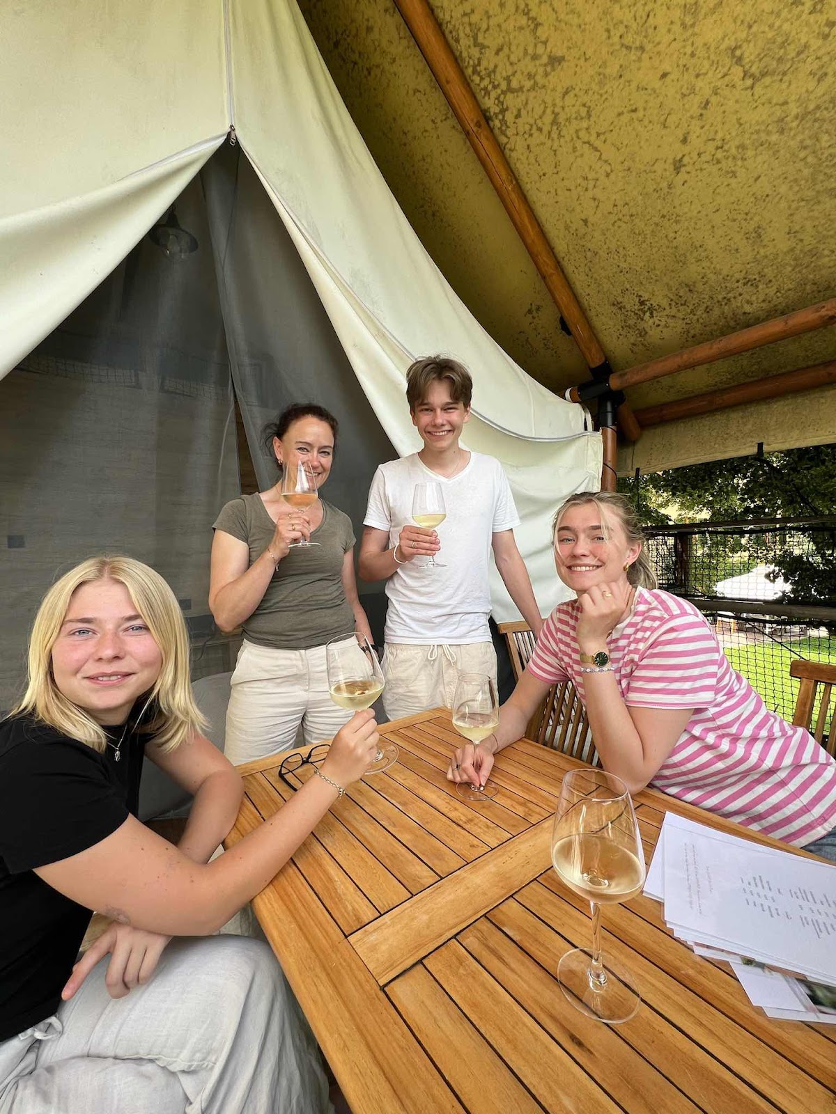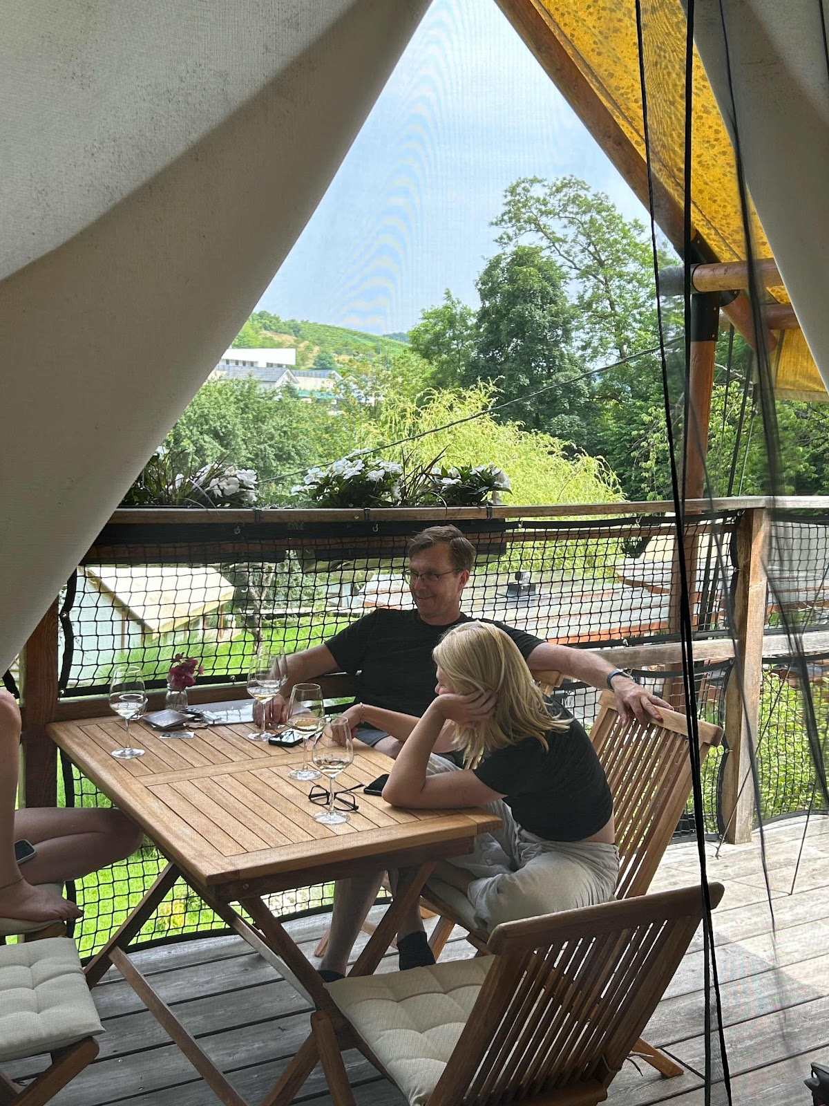 Efter ett lunchstopp vi floden Drava i Maribor kom vi fram till vårt härliga glsmpingställe på vingården Horvats bergssluttningar. En underbar värd tog emot oss och kom genast med några glas Pinot Grigo och Sauvignon Blanc som välkomstdrink. Wow i vårt tält i trädkronorna!