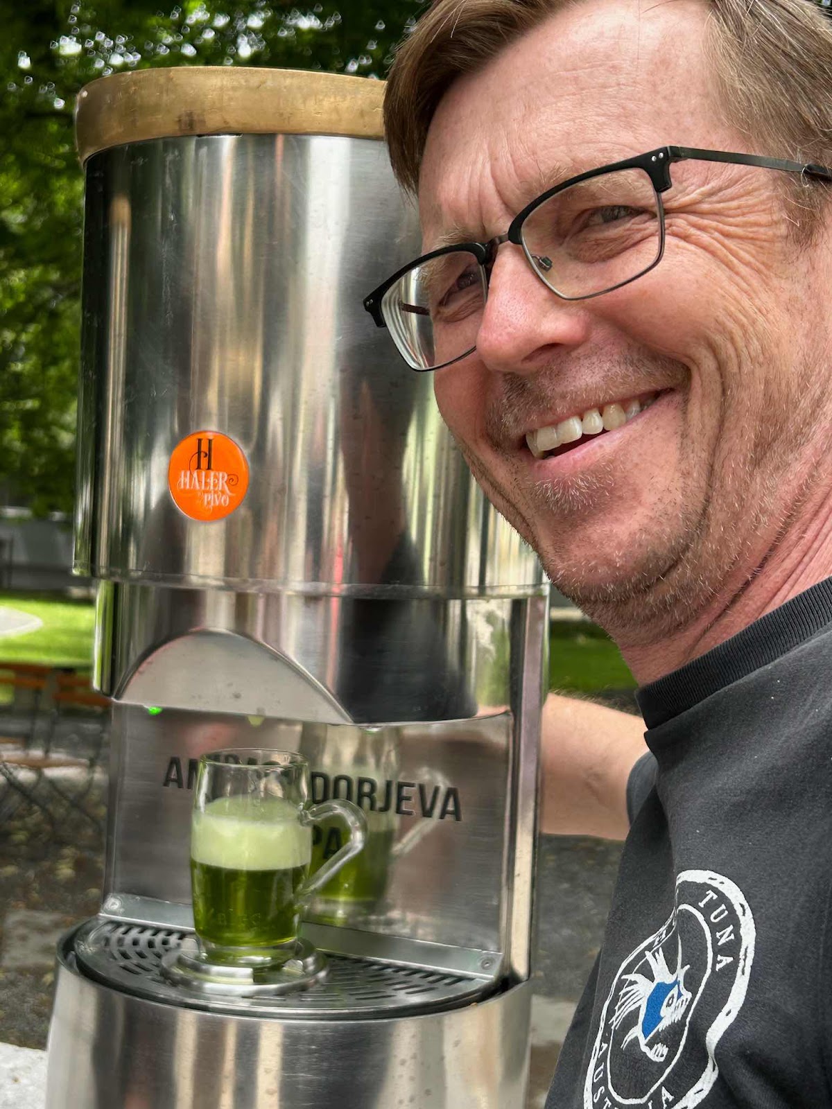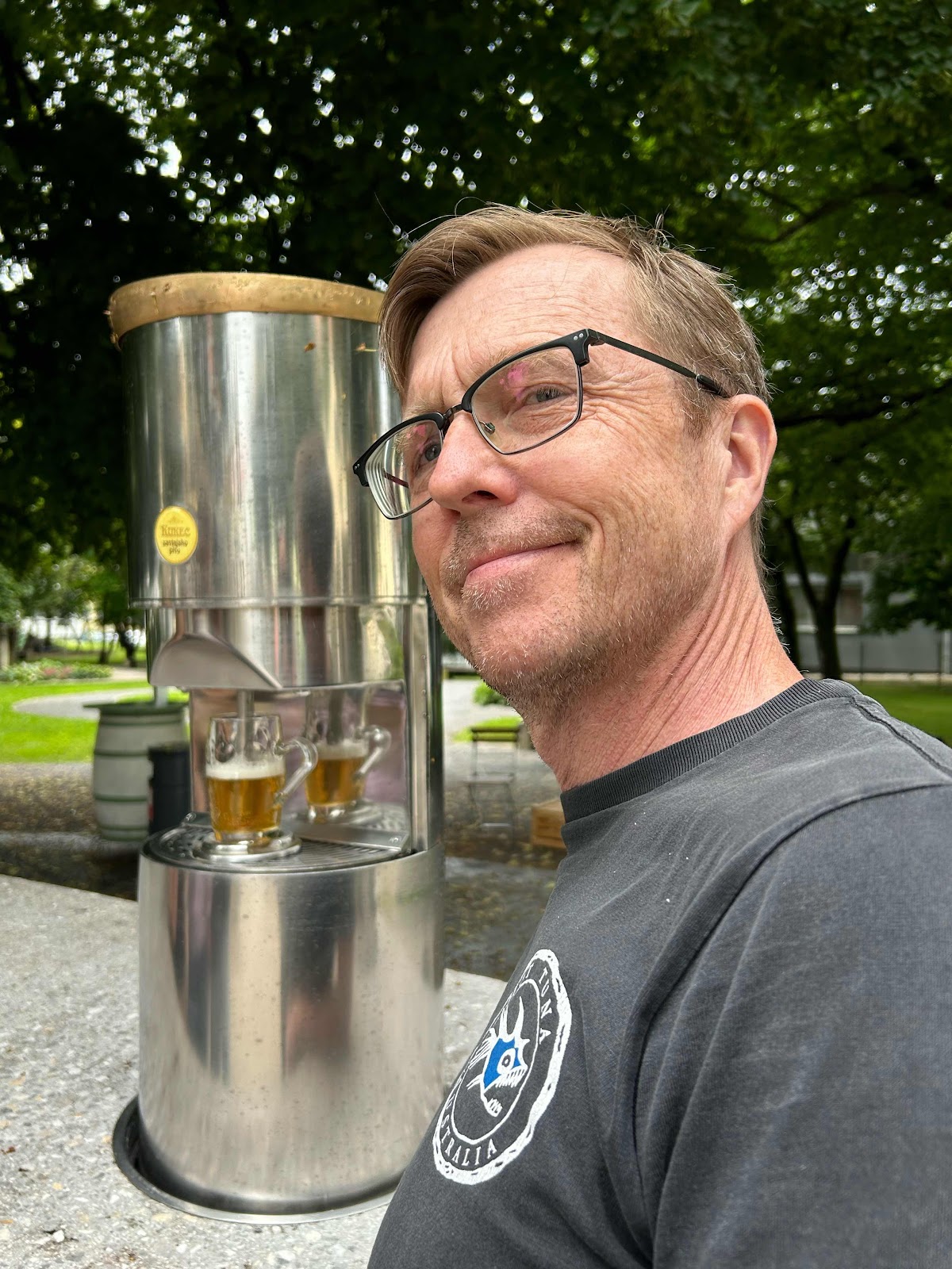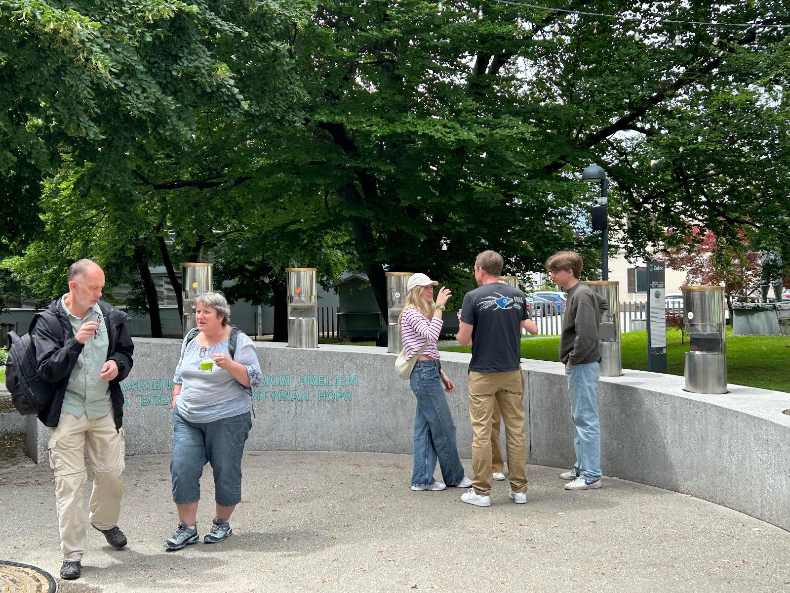 Vi lämnar vår kära glanping-site och gör ett lunchstopp vi världens första och ända ölfontän, Fontana Piva, i Zalec.