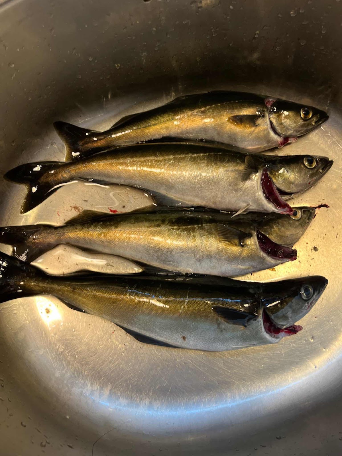 Ser gott ut❣️ Jag fick färskfångad makrill med havskräftor och räkor. Serverat utomhus. Husky