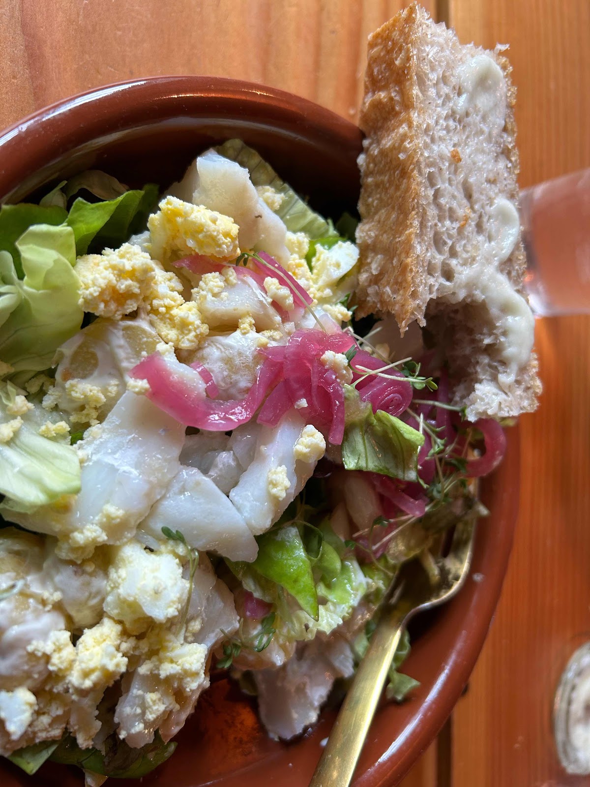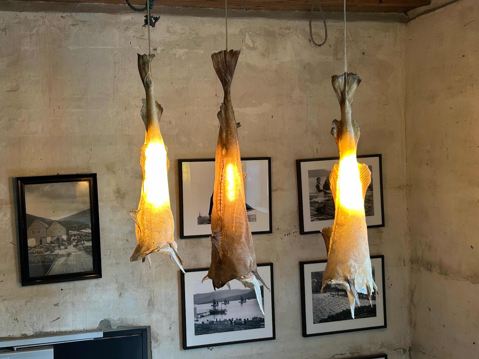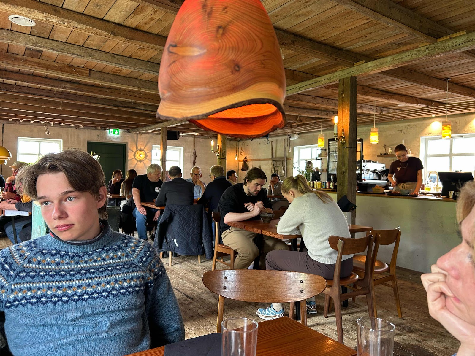 Lunch i världsklass i Sandavagur (gångavstånd från huset). Vi åt saltfisksallad, hembakat bröd och våfflor med rabarberkompott. Vi beundrade även torsk- och trälamporna