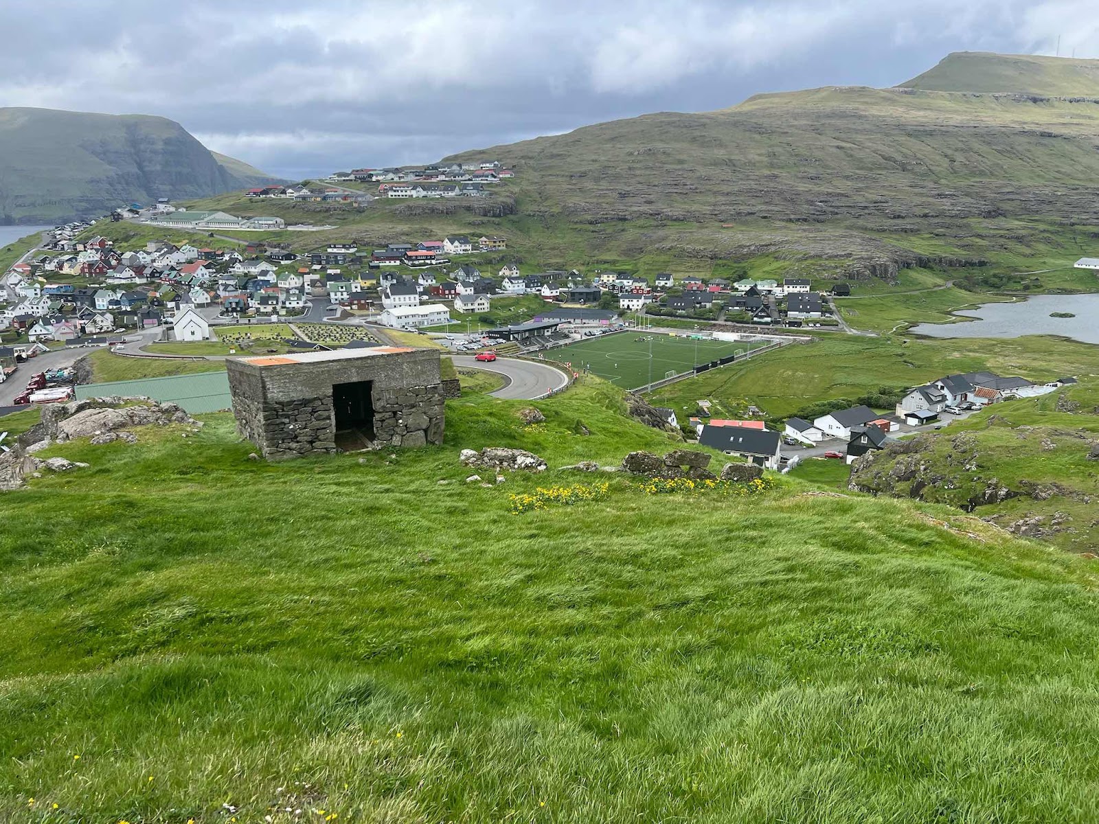 Storslaget läge för denna edsby och dess fotbollsplan.